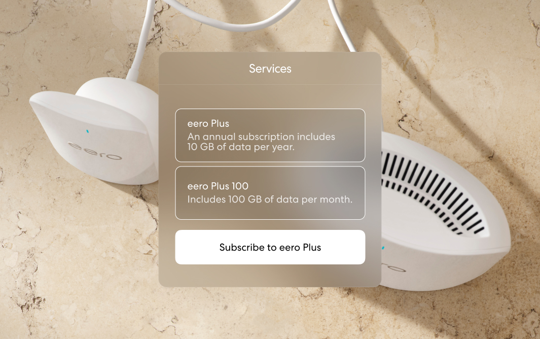 An annual eero Plus subscription provides 10 GB of backup data for eero Signal per year. For more regular or longer outages, get 100 GB of backup data per month with eero Plus 100. Additional backup data is also available for one-off needs.