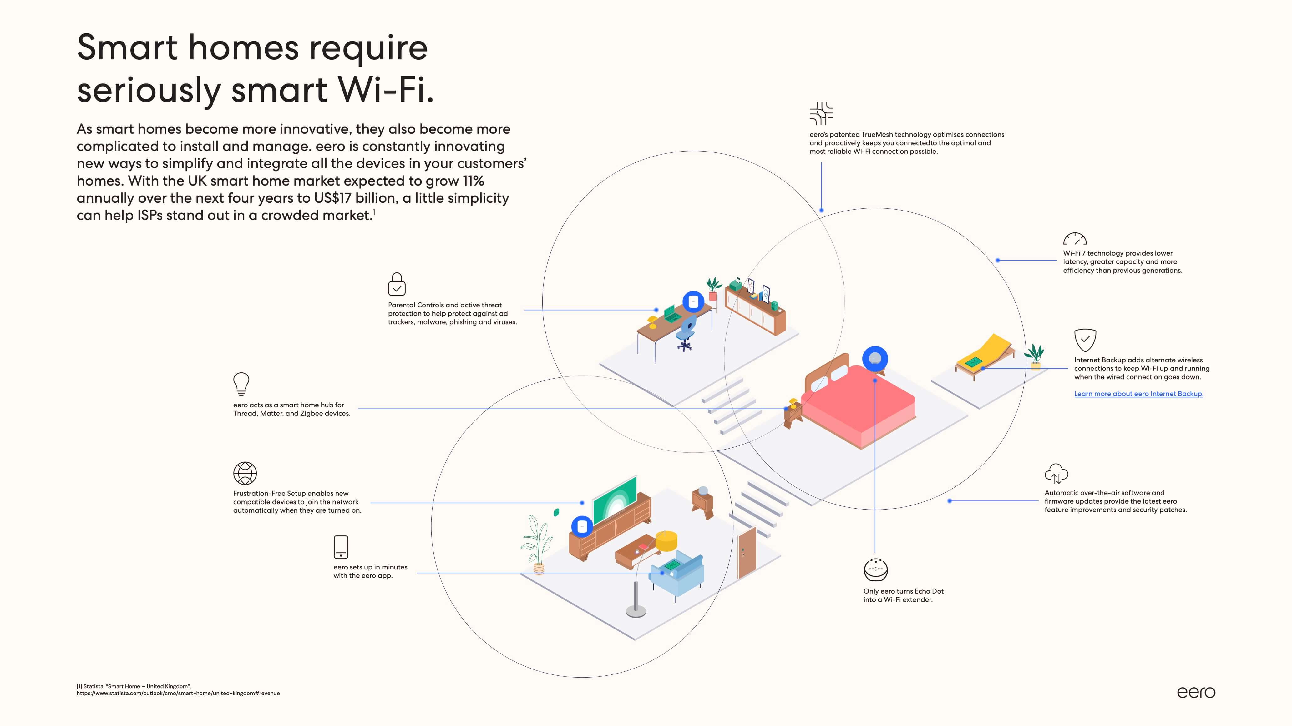 At eero, we’re redefining the smart home experience through interconnectivity, integrating seamless connectivity solutions that allow network owners to connect compatible smart home devices by simply powering them on. (No complex setup is needed.) This streamlined approach is the result of our unwavering commitment to delighting our customers and driving industry innovation forward.